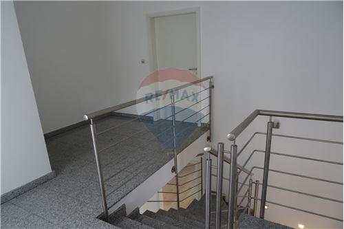 - A l’avant du bâtiment se trouve un garage (+/-30m2) à porte électrique, comprenant le local technique.